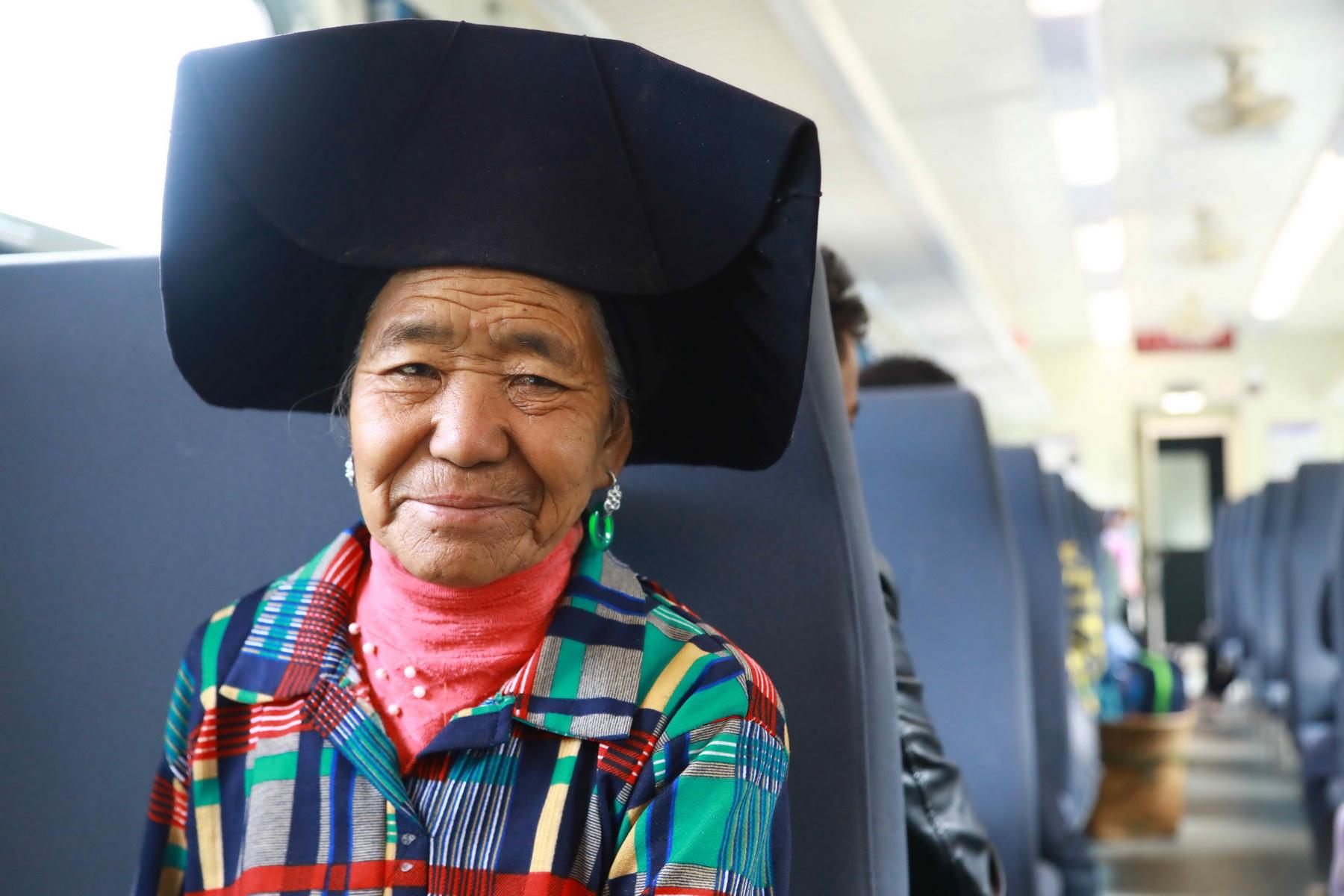 An old lady of the Yi nationality takes Train No. 5633 on May 17. (Photo/Li Kai)