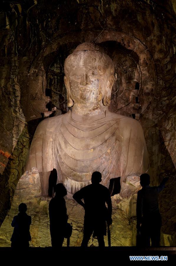 Tourists take part in a night tour at the Longmen Grottoes scenic area in Luoyang, central China's Henan Province, June 8, 2020. The Longmen Grottoes scenic area has introduced night tour programs since April 10 to meet tourist needs. Tourists can visit some of the finest Chinese Buddhist art here. (Xinhua/Li An)