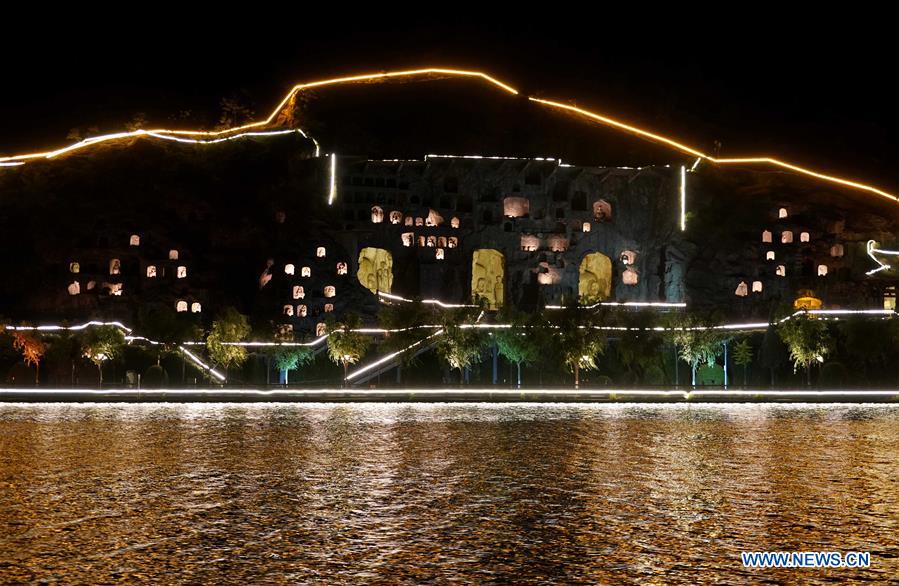 Photo taken on June 8, 2020 shows the Longmen Grottoes scenic area illuminated at night in Luoyang, central China's Henan Province. The Longmen Grottoes scenic area has introduced night tour programs since April 10 to meet tourist needs. Tourists can visit some of the finest Chinese Buddhist art here. (Xinhua/Li An)