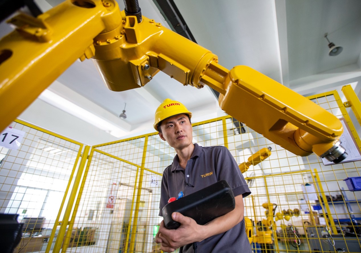 An employee of Chinese AI Robot company Turing Robot located in Hai'an Economic and Technological Development Area, east China's Jiangsu province debugs an industrial robot, June 8. Photo by Zhai Huiyong, People's Daily Online