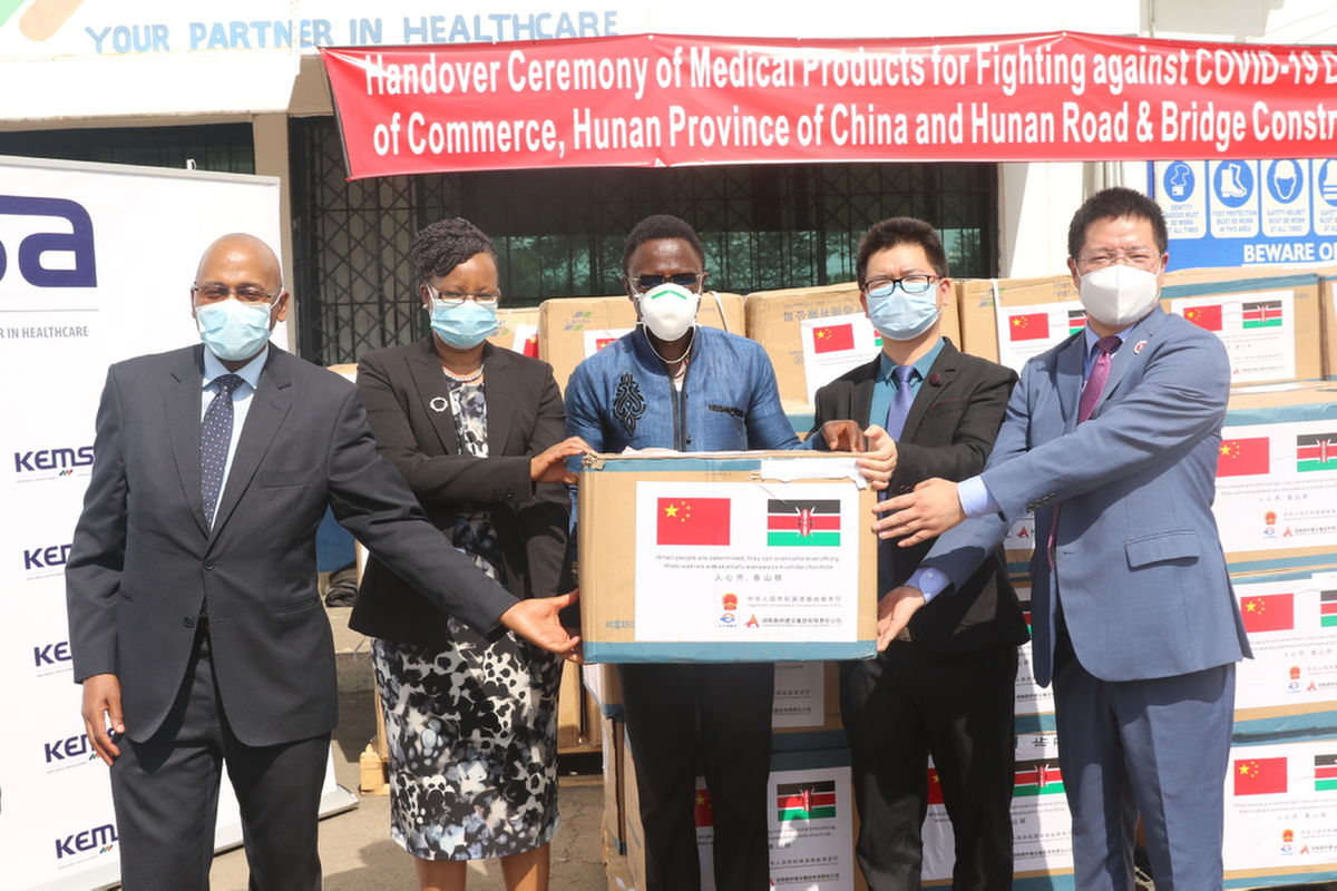 Zeng Kerong (second from right), general manager of HNRB's East African Regional Center, and Ababu Namwamba (center), chief administrative secretary of Kenya's Ministry of Foreign Affairs, pose for a photo at a handover ceremony for medical and protective materials donated by Chinese companies in Nairobi, Kenya's capital, on June 11, 2020. (From left: Solomon Kitungu, principal secretary of Kenya's State Department of Transport; Susan Mochache, principal secretary of Kenya's Ministry of Health; Ababu Namwamba; Zeng Kerong; Zhuo Wu, chairman of Kenya Chinese Chamber of Commerce). [Photo by Liu Hongjie/China Daily]