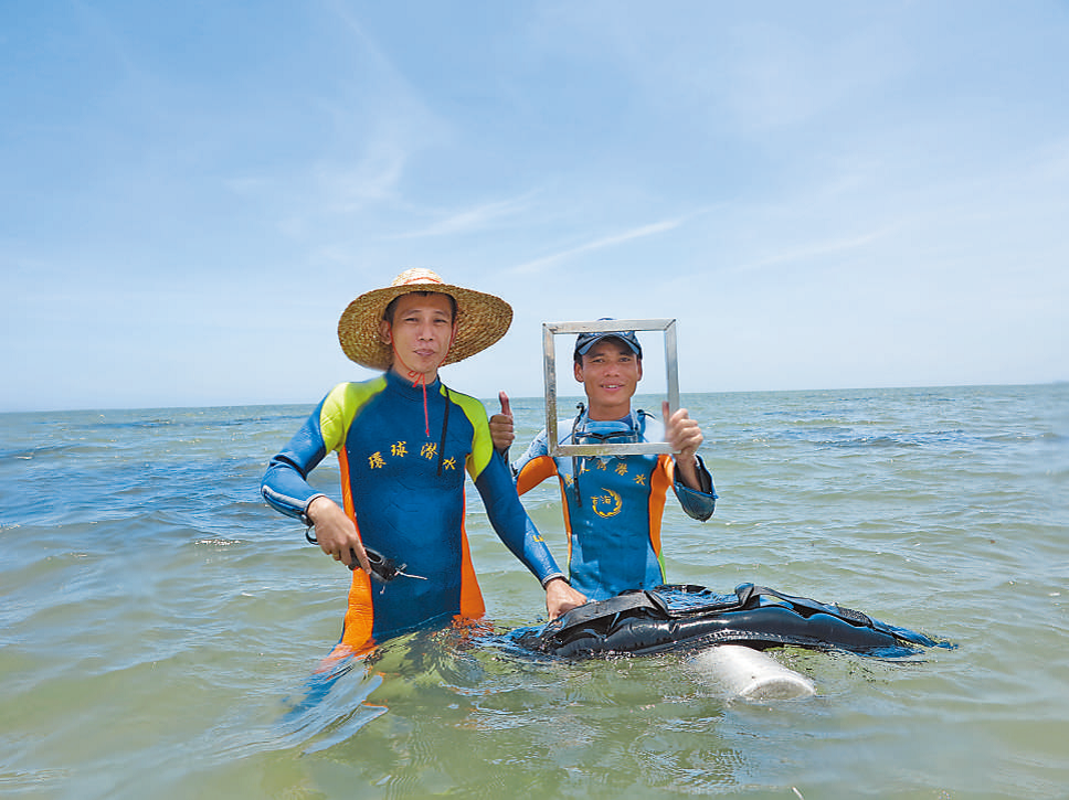 Researchers of the institute restore seagrass meadows. (Photo courtesy of an institute of marine ecology under Hainan Academy of Ocean and Fisheries Sciences)