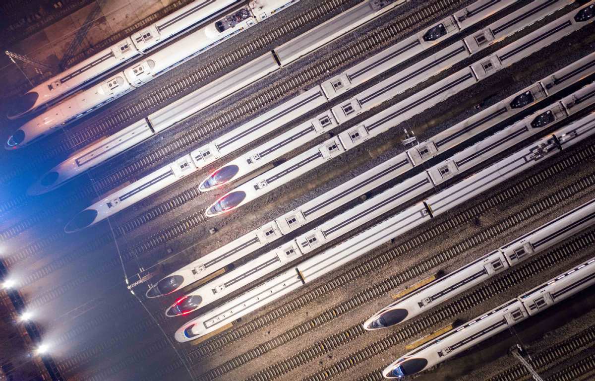 High-speed trains wait to run during the Spring Festival travel rush in Nanjing, East China's Jiangsu province, on Jan 10, 2020. [Photo by Su Yang/for chinadaily.com.cn]