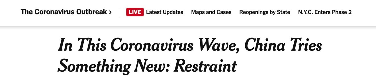 “Key to the government’s containment strategy is aggressive testing and contact tracing,” said the article, noting that the government set up testing stations at hospitals, park entrances, stadiums and community centers. Anyone going within blocks of the shuttered Xinfadi market receives an automated cellphone text message urging them to immediately take a test.