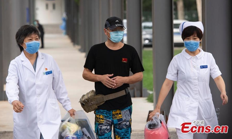 Photo shows cured patient He, the first COVID-19 patient to recover from the latest outbreak in Xinfadi wholesale market was discharged from Beijing Ditan Hospital, after testing negative for coronavirus two times, June 29, 2020. The 56-year-old man, surnamed He, is an airport shuttle bus driver, and was diagnosed as a coronavirus patient on June 13, two days after the resurgence in Xinfadi wholesale market. (Photo/China News Service)