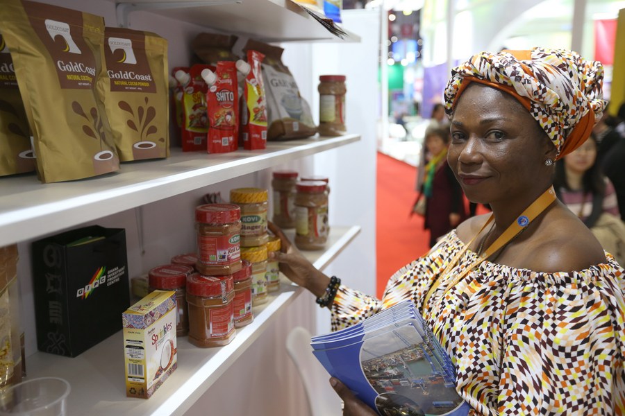 A staff member sorts products at the booth of Ghana at the first China International Import Expo (CIIE) in Shanghai, east China, Nov. 9, 2018. (Xinhua/Zhang Jiayang)