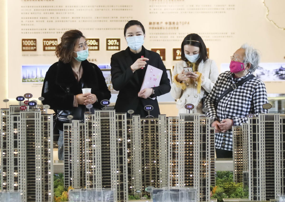 Citizens talk with the real estate sales assistant in Huaian, Jiangsu province, on March 22, 2020. [Photo by Zhao Qirui/for China Daily]
