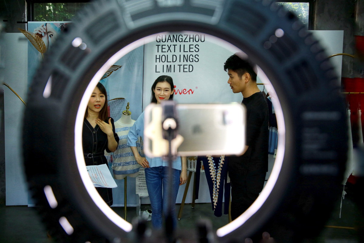 Employees of a Guangzhou, Guangdong province-based clothing company promote products during the online Canton Fair via a livestreaming platform on June 15. [Photo by Song Jinyu/for China Daily]