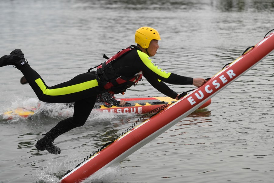 Rescuers conduct a water rescue drill in Wuxing District, Huzhou City, east China's Zhejiang Province, July 7, 2020. (Xinhua/Huang Zongzhi)