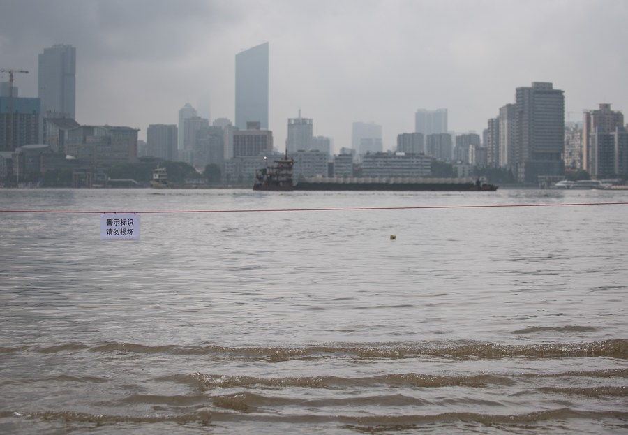 A warning sign is seen above the river in Wuhan, central China's Hubei Province, July 6, 2020. (Xinhua/Xiao Yijiu)