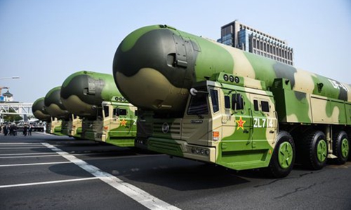 A formation of Dongfeng-41 intercontinental strategic nuclear missiles takes part in a military parade celebrating the 70th anniversary of the founding of the People's Republic of China in Beijing, capital of China, October 1, 2019. Photo: Xinhua