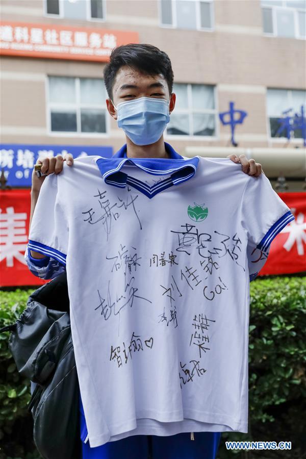 An examinee shows his school uniform with signatures of his schoolmates outside an exam venue in Beijing, capital of China, July 10, 2020. The annual national college entrance exam in Beijing concluded on Friday. (Xinhua/Shen Bohan)