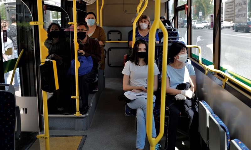 Passengers wearing masks sit in a bus in Nur-Sultan, Kazakhstan, on May 12, 2020. Photo:Xinhua