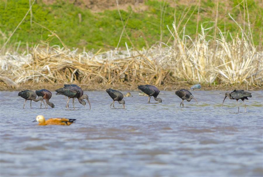 File photo taken on March 16, 2020 shows glossy ibises foraging in Jianhu Lake wetland nature reserve in Jianchuan County, southwest China's Yunnan Province. A group of rare ibis, once thought extinct in China, have been spotted in a nature reserve in southwest China's Yunnan Province. Eight glossy ibises were first sighted by workers in Jianhu Lake wetland nature reserve in Jianchuan County during a patrol in early June. Through follow-up monitoring and observation, researchers have found three young birds in the nest of the glossy ibis. (Jianhu Lake wetland nature reserve/Handout via Xinhua)