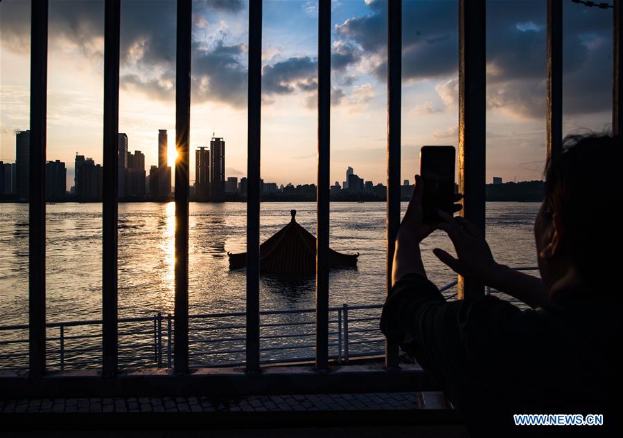 People take photos of a pavilion submerged by the Yangtze River with rising water level in Wuhan, central China's Hubei Province, July 13, 2020. The water level of Yangtze River in Hankou of Wuhan declined from the previous peak of 28.77 meters to 28.74 meters on Monday afternoon. (Xinhua/Xiao Yijiu)