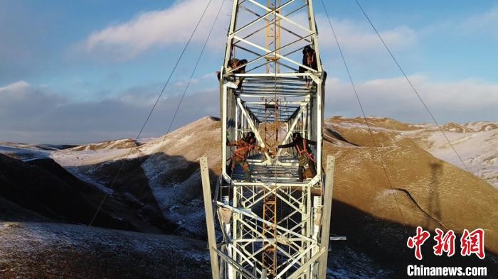 Workers check the installation of fittings of the 750 kV Hele section of the 800±kV direct current transmission line between northwest China’s Qinghai province and central China’s Henan province. (Photo by Wang Guodong/Chinanews.com)