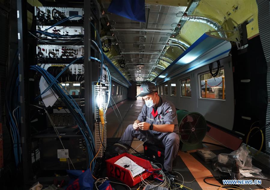 A technician works on a high-speed trains production line of CRRC Tangshan Co., Ltd. in Tangshan City in north China's Hebei Province, July 16, 2020. The production capacity of this company has recovered from the effect of COVID-19 with the help of local governments to fulfil the orders from home and abroad. (Xinhua/Xing Guangli)
