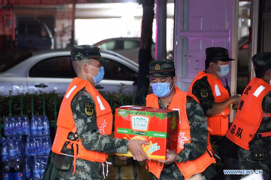 Members of the Chinese People's Armed Police Force help transfer goods from a supermarket during an emergency evacuation in Gaotai Township which lies within the Mengwa Flood Detention Area in Funan County, east China's Anhui Province, July 20, 2020. Hydrological authorities have issued a red alert for floods in the Huaihe River drainage area on Monday. An emergency evacuation was organized between late Sunday and early Monday for residents in the Mengwa Flood Detention Area to prepare against upcoming floods. (Xinhua/Huang Bohan)