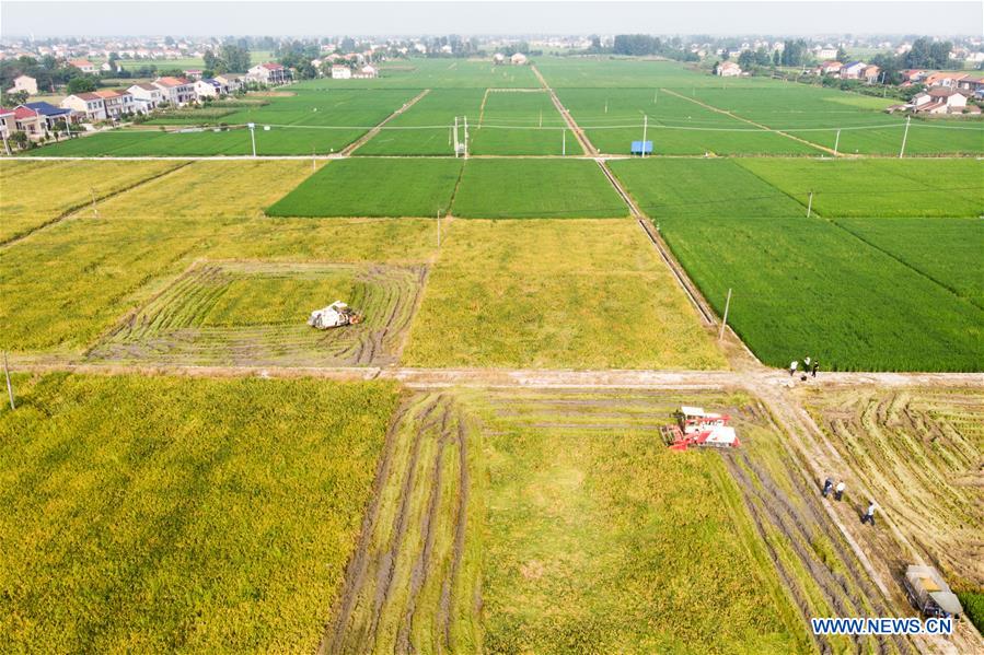 Aerial photo taken on July 20, 2020 shows villagers harvesting rice in Xiongjiawan Village in Lixian County, central China's Hunan Province. Villagers in Lixian County worked in paddy field to harvest early rice and replant late rice after heavy rain. (Xinhua/Chen Sihan)