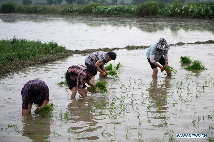 Villagers transplant rice seedlings in Gaitian Village in Lixian County, central China's Hunan Province, July 20, 2020. Villagers in Lixian County worked in paddy field to harvest early rice and replant late rice after heavy rain. (Xinhua/Chen Sihan)