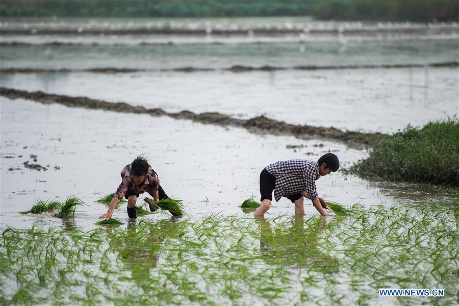 Villagers transplant rice seedlings in Gaitian Village in Lixian County, central China's Hunan Province, July 20, 2020. Villagers in Lixian County worked in paddy field to harvest early rice and replant late rice after heavy rain. (Xinhua/Chen Sihan)