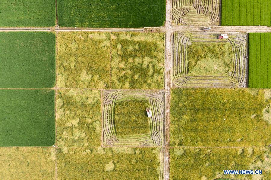 Aerial photo taken on July 20, 2020 shows villagers harvesting rice in Xiongjiawan Village in Lixian County, central China's Hunan Province. Villagers in Lixian County worked in paddy field to harvest early rice and replant late rice after heavy rain. (Xinhua/Chen Sihan)