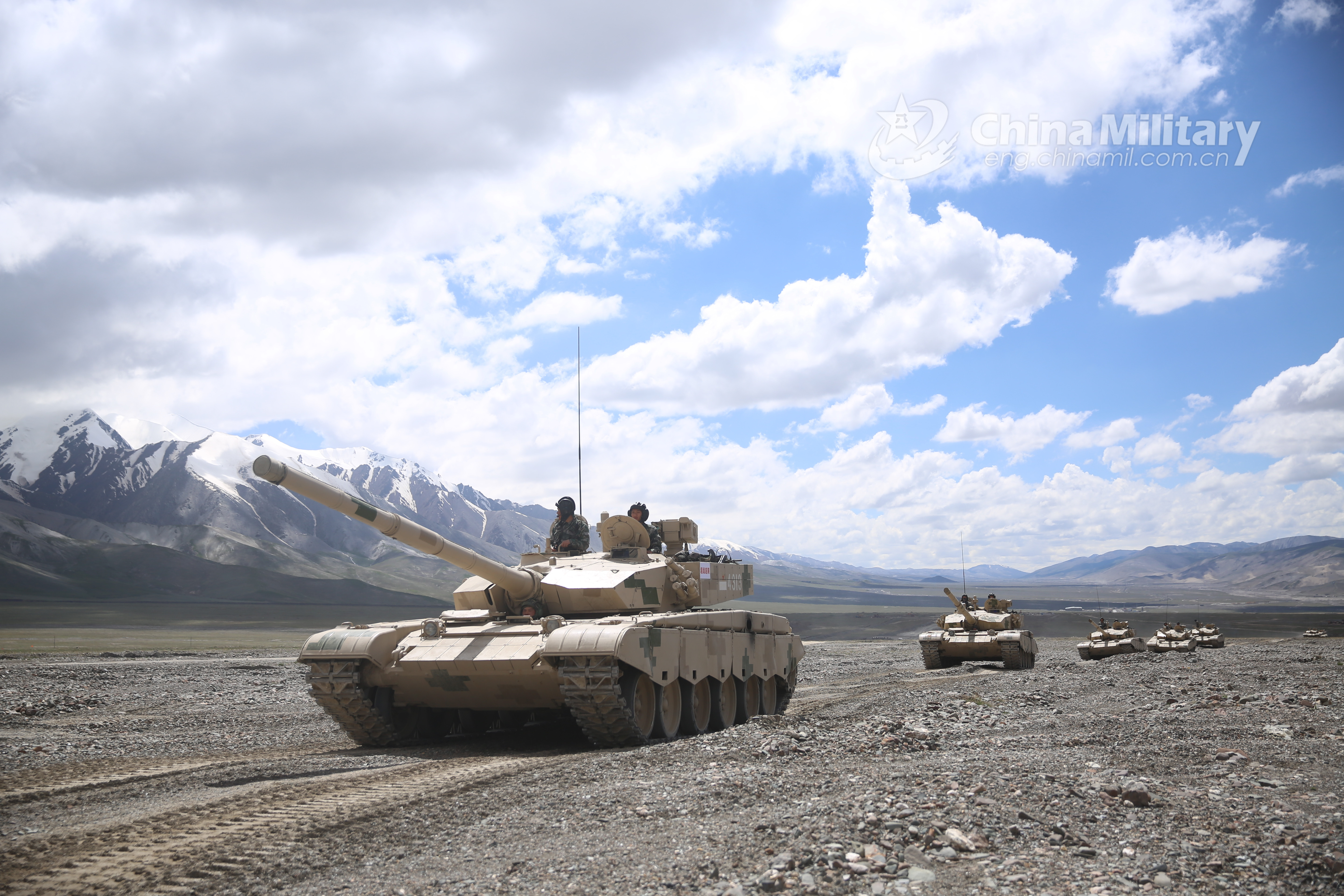 Main battle tanks attached to a tank detachment with a brigade under the PLA 76th Group Army rumble through cobbled path during a long-distance maneuver to a designated field in plateau area on July 14, 2020. (eng.chinamil.com.cn/Photo by Cao Xuguang)