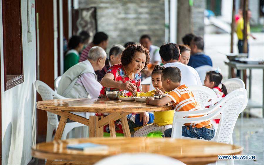 Tourists dine at a restaurant in Shanbao community of Jiuba Township, Tongzi County, southwest China's Guizhou Province, July 21, 2020. Rural development in Tongzi County has gained new momentum in recent years as efforts are put into local tourism which features beautiful countryside hostels. So far, more than 500 locally registered poverty-stricken rural residents have been directly employed in the tourism industry. Meanwhile, some 6,000 others have seen their income rise while working in tourism-related businesses. (Xinhua/Tao Liang)