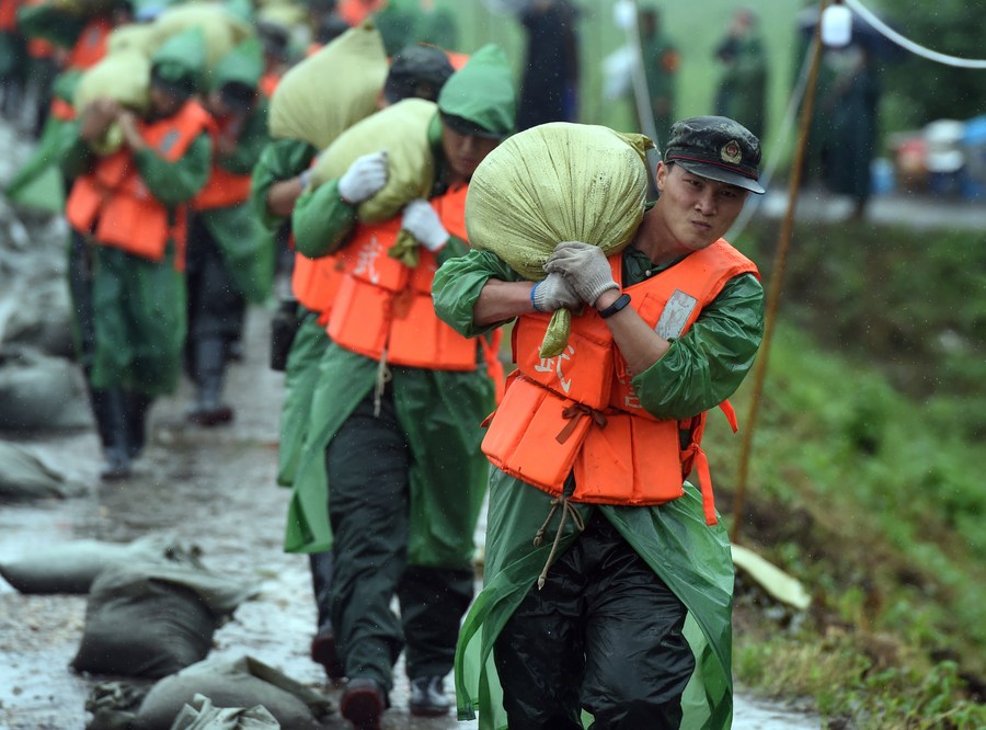 Members of the armed police carry sandbags to reinforce a section of the levee in Baimao Town of Wuhu, east China's Anhui Province, July 16, 2020. (Xinhua/Zhou Mu)