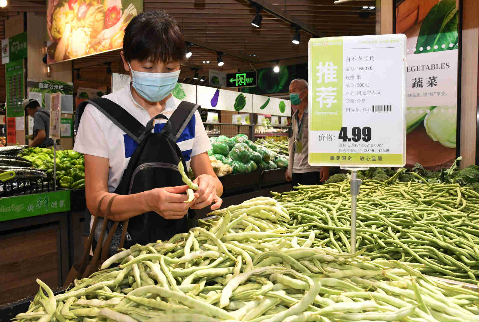 A woman selects green beans from Chicheng County of Hebei Province at a supermarket in Beijing, capital of China, July 23, 2020. (Xinhua/Ren Chao)
