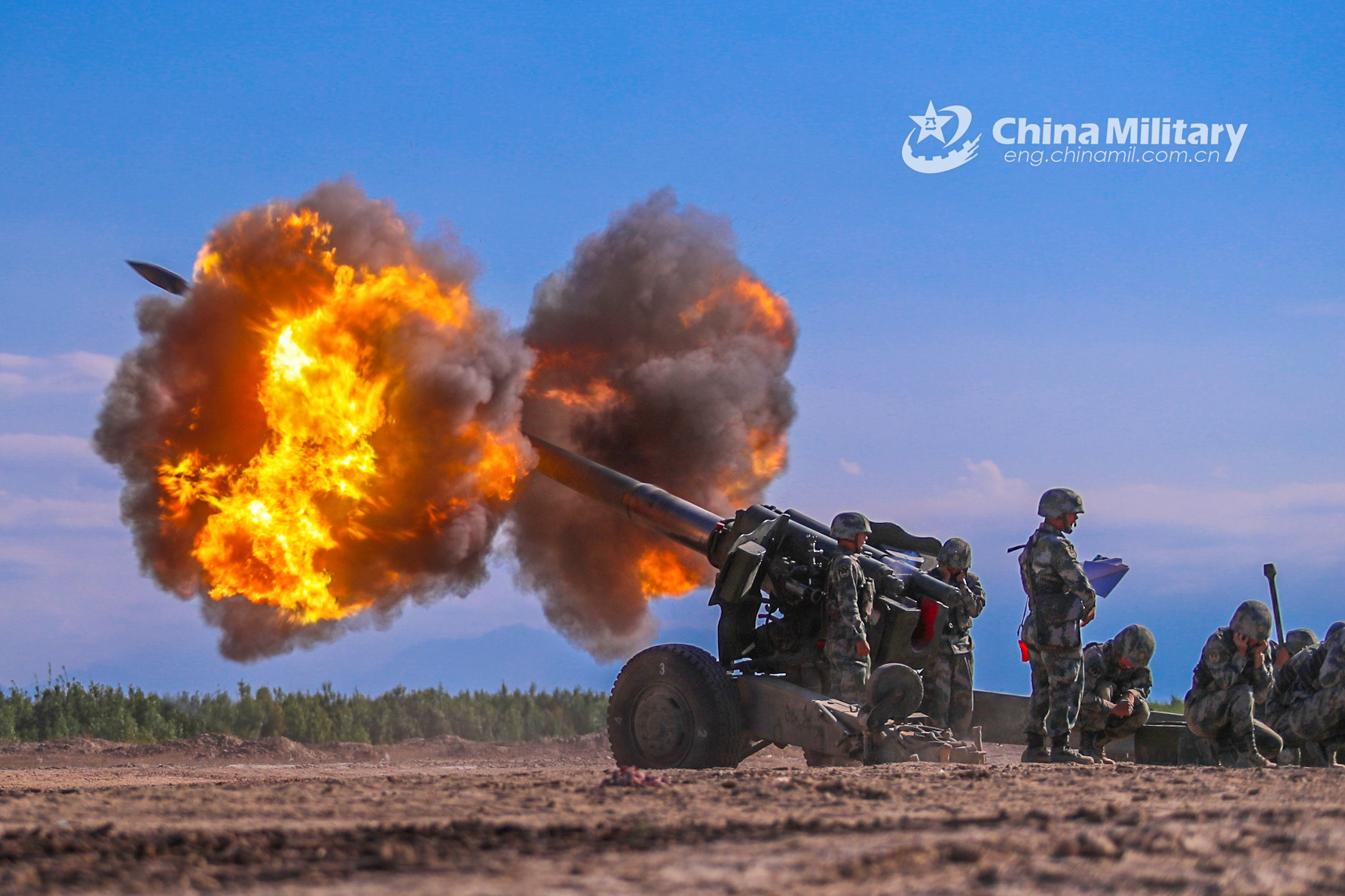 Soldiers assigned to a regiment under the PLA Xinjiang Military Command fire anti-aircraft artilleries during a field live-fire test in northwest desert area after a long-distance maneuver in late July, 2020. (eng.chinamil.com.cn/Photo by Chen Ming, Tai Hao, Liu Xiaoyun and Huang Feihao)
