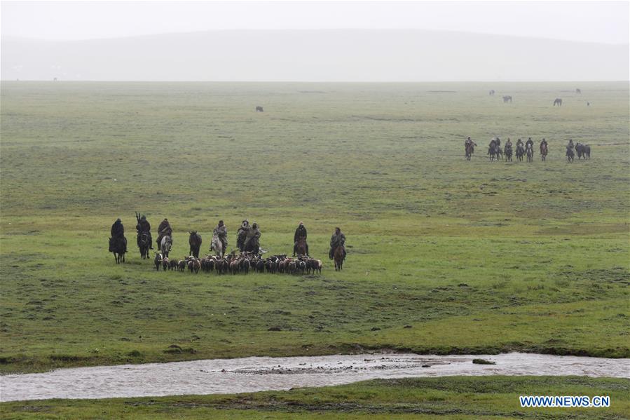 Local herdsmen lead a herd of sheep to the pasture Qianyangya in Koce Township of Gannan Tibetan Autonomous Prefecture, northwest China's Gansu Province, July 25, 2020. Since the 1980s, the pasture in Koce Township has been used as an area to reunite lost and found livestock with their owners. Once a year, local herdsmen gather here for one day to bring the livestock they have found while herding and look for their lost ones by identifying the body marks on cattle or sheep. The livestock can be brought home when their ownership is confirmed by most attendees. So far, over 20,000 lost and found livestock have returned to their owners. (Xinhua/Du Zheyu)
