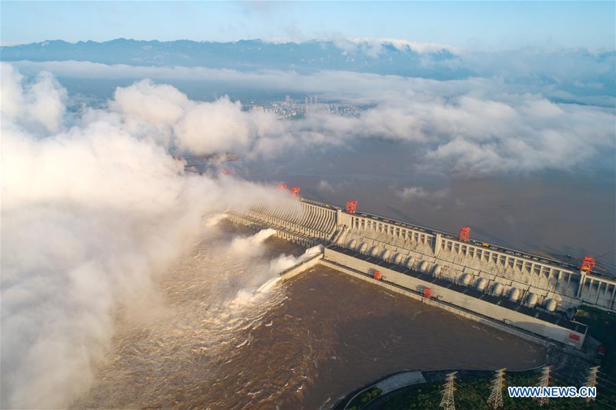 Aerial photo taken on July 27, 2020 shows floodwater being discharged from the Three Gorges Dam in central China's Hubei Province. The third flood of the year in the Yangtze River occurred in its upper reaches as the Three Gorges reservoir saw an inflow of 50,000 cubic meters per second at 2 p.m. Sunday. (Photo by Wang Gang/Xinhua)