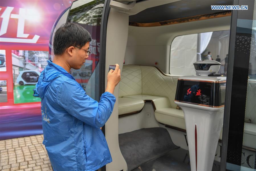 A visitor takes pictures of a concept vehicle during an event showcasing the products and culture of China's iconic auto brand Hongqi in Changchun, northeast China's Jilin Province, July 28, 2020. (Xinhua/Zhang Nan)