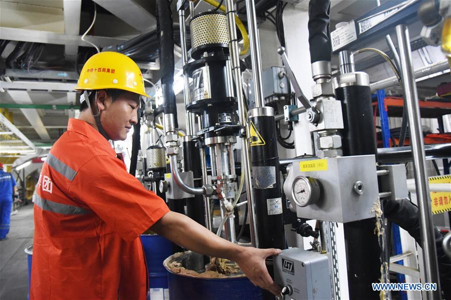 A constructor works at the construction site of China's first tunnel across the Yellow River in Jinan, east China's Shandong Province, July 29, 2020. Located in Jinan, the 15.76-meter-diameter tunnel is the country's widest shield tunnel for both rail and road transport. With a total length of 4.76 km, the tunnel contains two levels. A two-way six-lane highway is on the upper level and the lower level is reserved for rail transit, flues and escape channels. (Xinhua/Wang Kai)