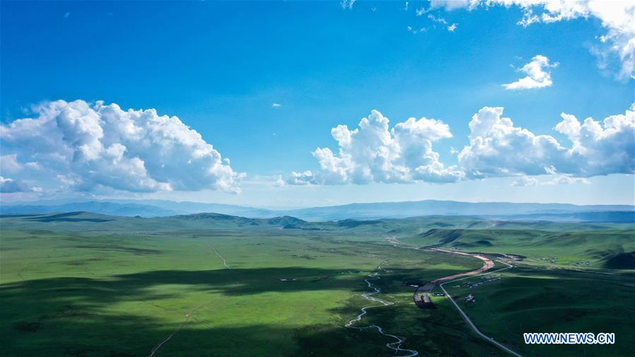 Aerial photo taken on July 30, 2020 shows the view of Jinyintan grasslands in Haibei Tibetan Autonomous Prefecture, northwest China's Qinghai Province. (Xinhua/Wu Gang)