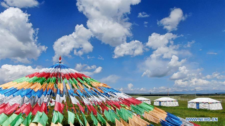 Aerial photo taken on July 30, 2020 shows Mongolian yurts used as a family hostel on Jinyintan grasslands in Haibei Tibetan Autonomous Prefecture, northwest China's Qinghai Province. (Xinhua/Zhang Hongxiang)