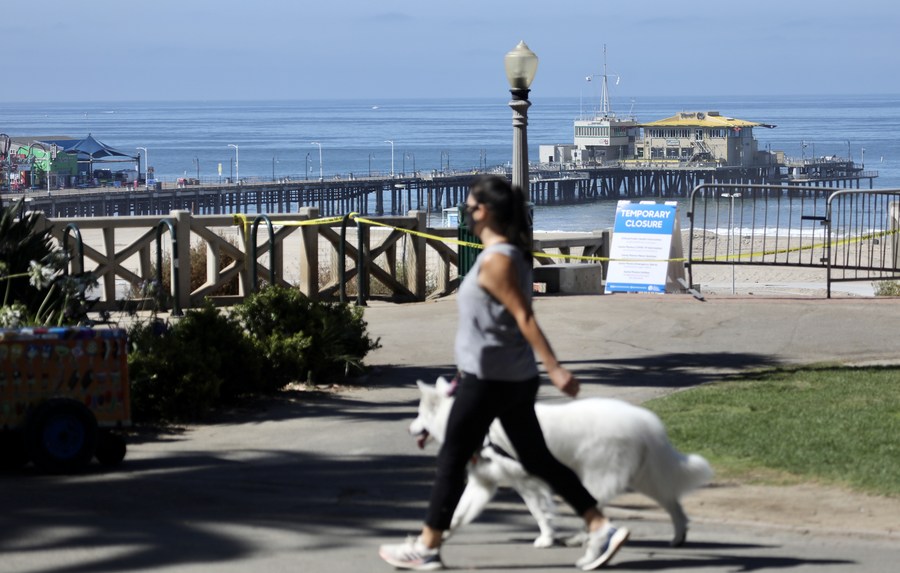 Photo taken on July 4, 2020 shows the closed Santa Monica beach in Los Angeles County, the United States. (Xinhua)
