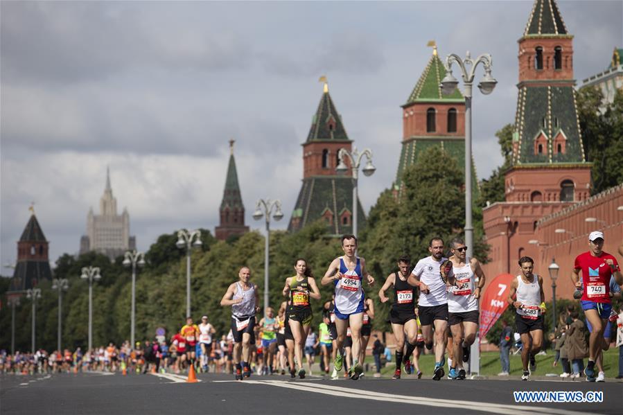 Runners compete during the Moscow Half Marathon in Moscow, Russia on Aug. 2, 2020. (Photo by Alexander Zemlianichenko Jr/Xinhua)