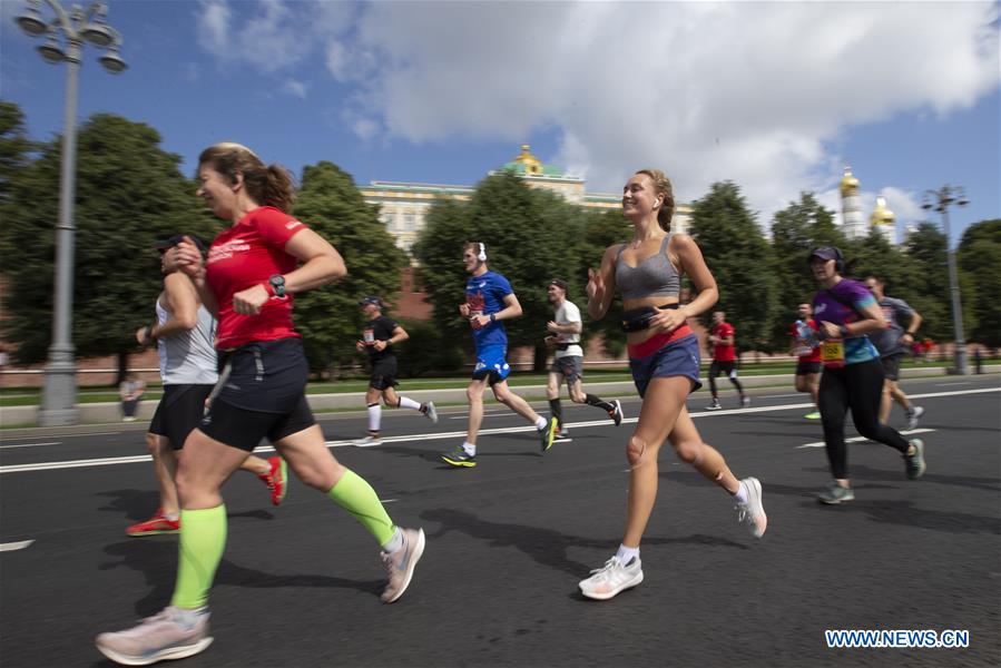Runners compete during the Moscow Half Marathon in Moscow, Russia on Aug. 2, 2020. (Photo by Alexander Zemlianichenko Jr/Xinhua)