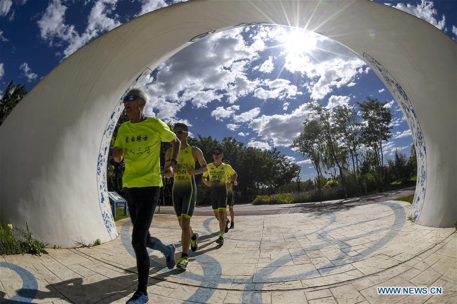 Photo taken on July 26, 2020 shows Gu Dawo (1st L), an endurance sports enthusiast, stretching together with his triathlon club teammates after attending a cycling training in Yinchuan, northwest China's Ningxia Hui Autonomous Region. Gu Dawo, a 75-year-old Chinese grandpa, finished this year's Xiamen International Marathon with a remarkable time of 4 hours, 23 minutes and 45 seconds, which astonished many younger runners. Having embarked on training for marathon at the age of 69, Gu finished his first half marathon in 2013. Since then, Gu has begun running numberous marathon events across China. In 2017, Gu showed up as the oldest-ever offical pacer in Yinchuan Internaional Marathon. After swimming and cycling became parts of his daily fitness, Gu made attempts to train for triathlon, a multisport with three continuous and sequential endurance races. In 2017, he went to Chattanooga of Tennessee of the United States to compete in the Ironman 70.3. As the oldest one to complete the triathlon in the event, Gu was introduced to be from China in the award ceremony. Gu Dawo wants to encourage the young to exercise more, and also correct their bias against the aged. "The age will not stop my heart and feet from running ahead." Gu said. (Xinhua/Feng Kaihua)