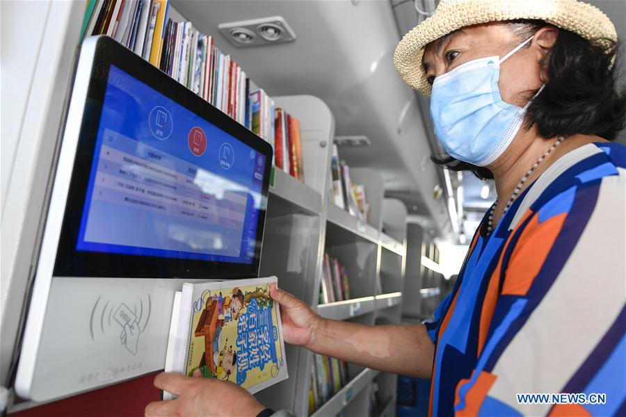 A citizen borrows a book at a mobile library transformed from a bus in Changchun, northeast China's Jilin Province, Aug. 5, 2020. Changchun Library converted a bus into a mobile library which circulates at 15 fixed service points to provide citizens with book lending service. (Xinhua/Xu Chang)