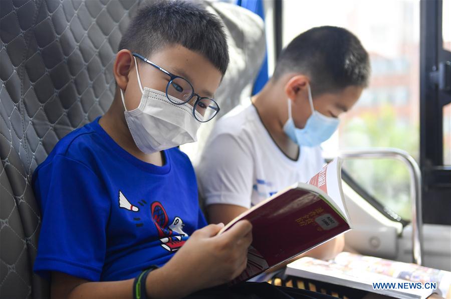 Children read books at a mobile library transformed from a bus in Changchun, northeast China's Jilin Province, Aug. 5, 2020. Changchun Library converted a bus into a mobile library which circulates at 15 fixed service points to provide citizens with book lending service. (Xinhua/Xu Chang)