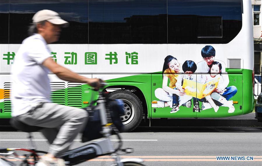 A man riding a bicycle passes a mobile library transformed from a bus in Changchun, northeast China's Jilin Province, Aug. 5, 2020. Changchun Library converted a bus into a mobile library which circulates at 15 fixed service points to provide citizens with book lending service. (Xinhua/Xu Chang)