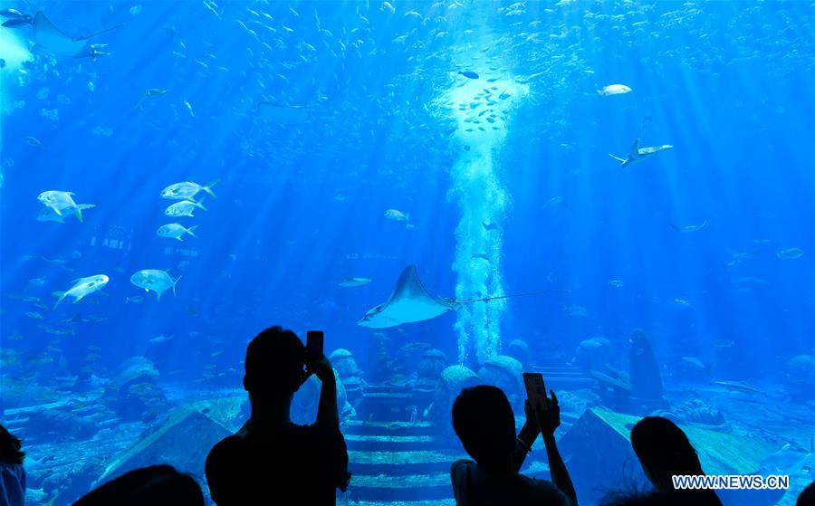 Tourists visit an aquarium at the Atlantis resort in Sanya, south China's Hainan Province, Aug. 6, 2020. During the summer vacation, Sanya's tourism industry accelerated its recovery. (Xinhua/Yang Guanyu)