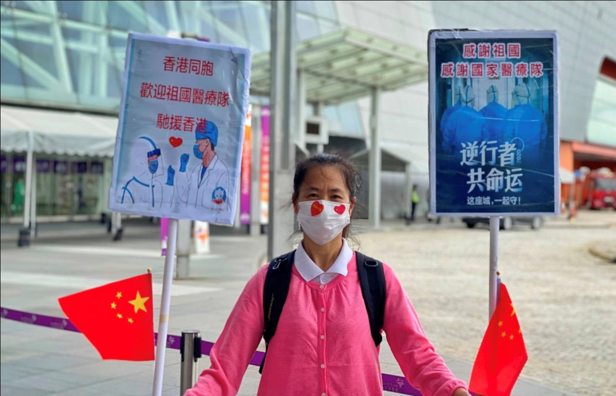 Photo shows a Hong Kong citizen welcoming the seven nucleic acid testing professionals from the Chinese mainland. (Photo/CCTV News)
