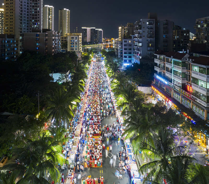 Photo taken on July 25 shows a busy scene in a famous night fair at the south gate of Hainan University, Haikou, south China’s Hainan province. (Photo by Zhou Xiujian/ People’s Daily Online)