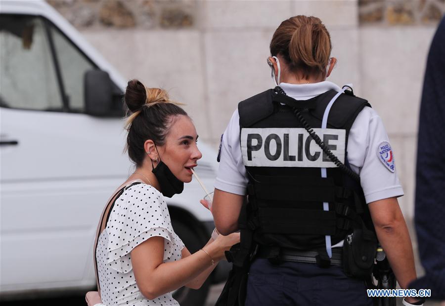 A policewoman informs a visitor to wear her mask at the Montmartre in Paris, France, Aug. 10, 2020. Masks will be compulsory for people aged 11 and over in crowded areas in Ile-de-France -- Paris and its surrounding areas, starting from Monday morning, the prefecture announced on Saturday. In Paris, it will involve tourist sites, open markets, areas around stations, banks of the Seine and of Canal Saint-Martin and other places where social distancing is difficult, police of the French capital said in a Tweeter message. (Xinhua/Gao Jing)