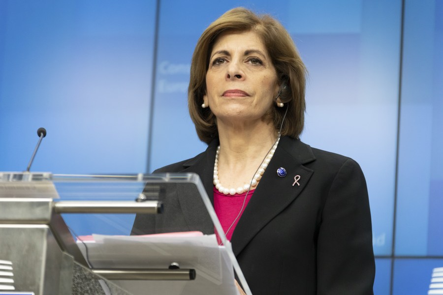 Stella Kyriakides, European Commissioner for Health and Food Safety, attends a press conference after the EU Health Affairs Council in Brussels, Belgium, on March 6, 2020. (Photo by Riccardo Pareggiani/Xinhua)