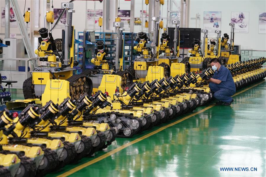 A worker debugs a special robot at a workshop in the Tangshan Hi-tech Industrial Development Zone in Tangshan, North China's Hebei province, on July 17, 2020. [Photo/Xinhua]
